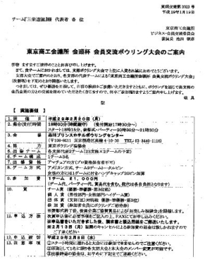 ![]() | 去年の11月に行われた商工会議所の 東京会頭杯の案内が届きました。 三栄造園チームは、世田谷支部の代表として 参加しますが東京都には23支部あるそうで 今度の大会は各支部2チーム46チームの戦いになります。 会場は品川プリンスホテルボウリングセンターです。 |