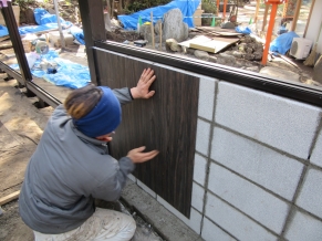 ![]() | 今回は木目のボードを 選んでいただきました。 ブロックの上に両面テープと 接着剤をつけ取付けていきます。 |