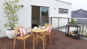 | 屋上に作るリビングガーデンの一例です。 プランター:ラウンドポッド ローコ大 テーブル&椅子:ロータステーブルセット 物入れ:庭座 シンプルシェリフ 写真のように床にデッキ材を敷くと 更に雰囲気が良くなります。 | ![]() |
