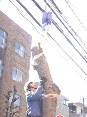 ![]() | クレーンで幹の上部を支えます。 このあと幹を切断しますが、 その際に上部の幹が地上に落下しないように するためです。 |