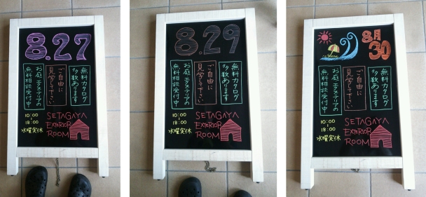 ![]() | そして、出来たボードをお店の外に出して、 開店準備完了です。 8月30日(金)世田谷エクステリアルーム 開店です! 明日から週末ですね。 お気軽にご来店ください。 スタッフ一同、お待ちしております! |